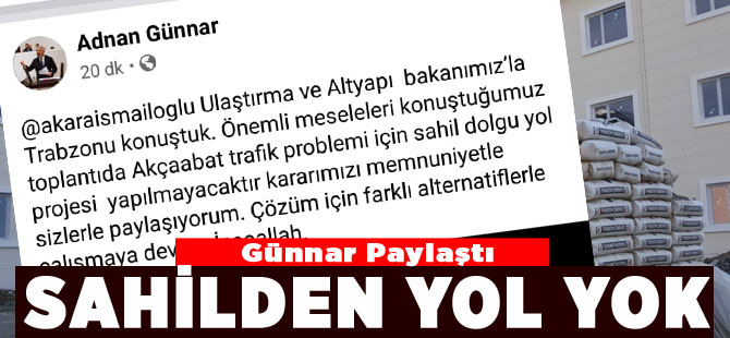 Milletvekili Günnar, sosyal medya hesabından yaptığı paylaşımda “Ulaştırma ve Altyapı bakanımız’la Trabzon’u konuştuk. Önemli meseleleri konuştuğumuz toplantıda Akçaabat trafik problemi için sahil dolgu yol projesi yapılmayacaktır kararımızı memnuniyetle sizlerle paylaşıyorum. Çözüm için farklı alternatiflerle çalışmaya devam İnşaallah” dedi.